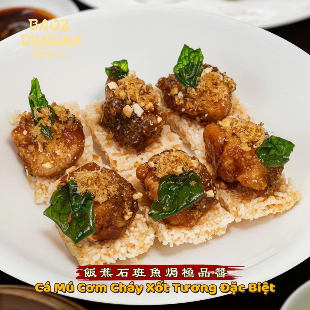 Cá mú ngọt thịt kết hợp cơm cháy giòn tan và xốt tương bí truyền của bếp trưởng Baoz Dimsum – một dấu ấn lôi cuốn trong hành trình vị giác mới.